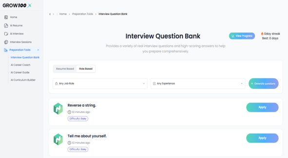 Grow100x completely transformed my resume and interview prep. I started getting callbacks within a week, and the AI feedback felt like having a personal mentor. It gave me clear, actionable insights that I could immediately apply to improve my performance significantly and consistently.